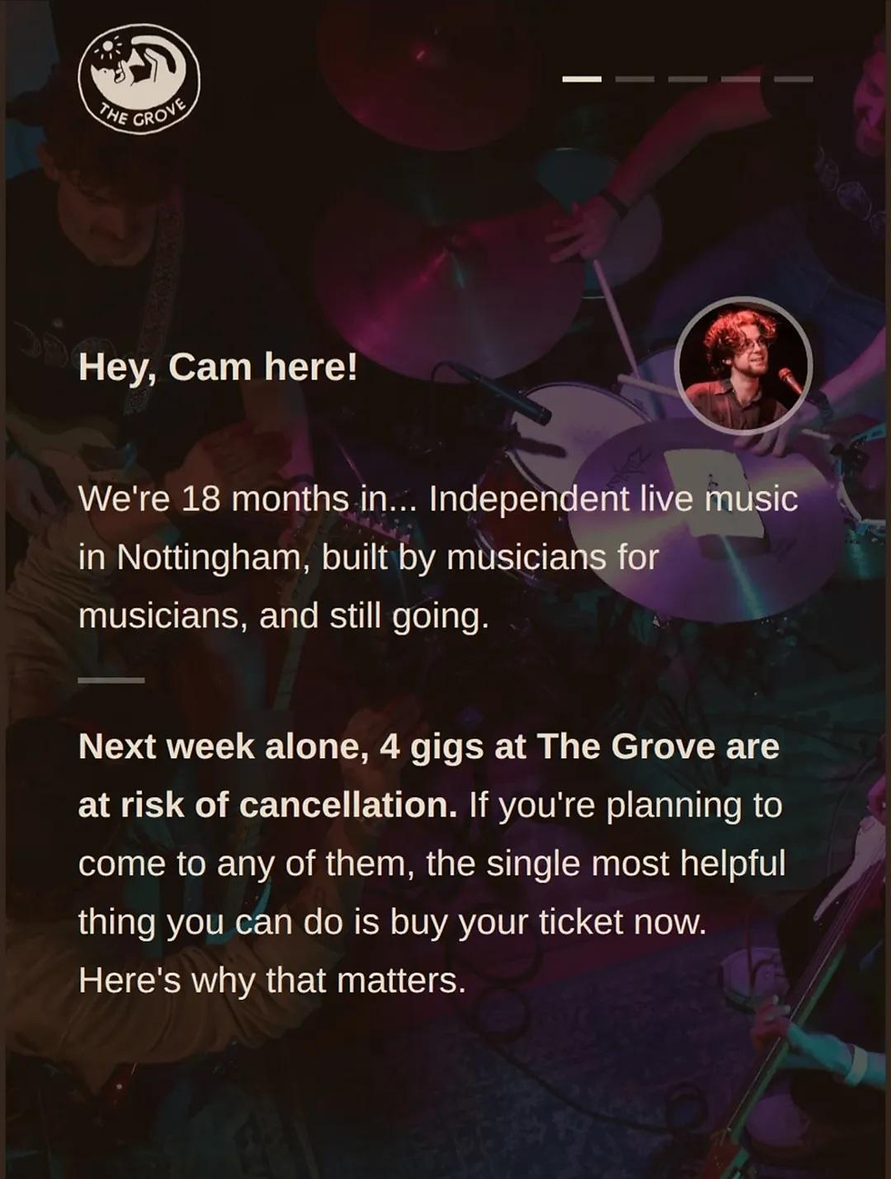 On Friday, I began to weigh up my options more of who to contact, and landed on one definite person that I wanted to contact, that I thankfully already had previous connections with from the last project, and who had said I could contact him again if needed for another project. He is the owner of an independent music venue called The Grove, which opened 18 months ago. On that morning too, fortunately for my topic but also unfortunately, he had made a post, detailing that even just in the next week he had the risk of potentially having to cancel 4 gigs. He of course said it is something that neither him or the artist wanted to do, and in these circumstances they would prefer to play for a loss instead of cancelling which is something that no artist wants to or should have to do.